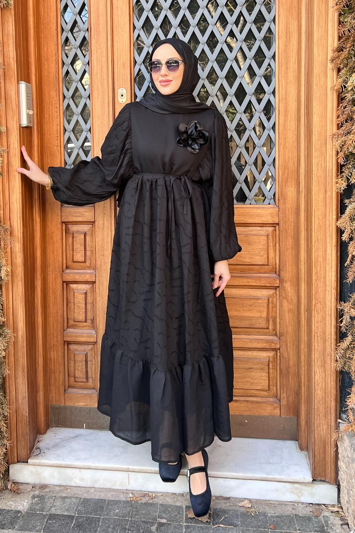 ELBİSEŞifon Elbise Gül Aksesuarlı 1072 Siyah